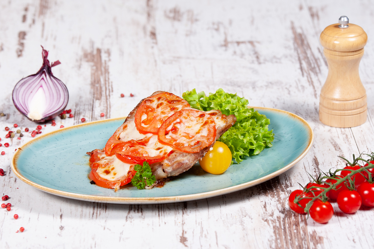 csülökszeletek fokhagymával, paradicsomszeletekkel, mozzarella sajttal kemencében sütve