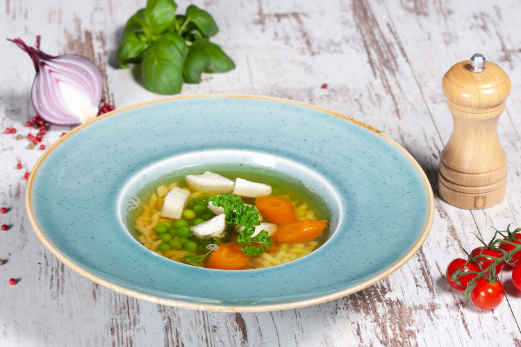 650 ml. sárgarépa, fõtt csirkehús, borsó, lúdgégetészta, gazdagon húslevessel