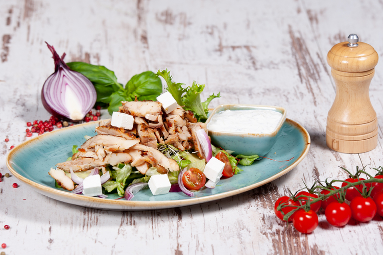 gyros hús, kígyóuborka, paradicsom, jégsaláta, lilahagyma, feta sajt, tsatsiki