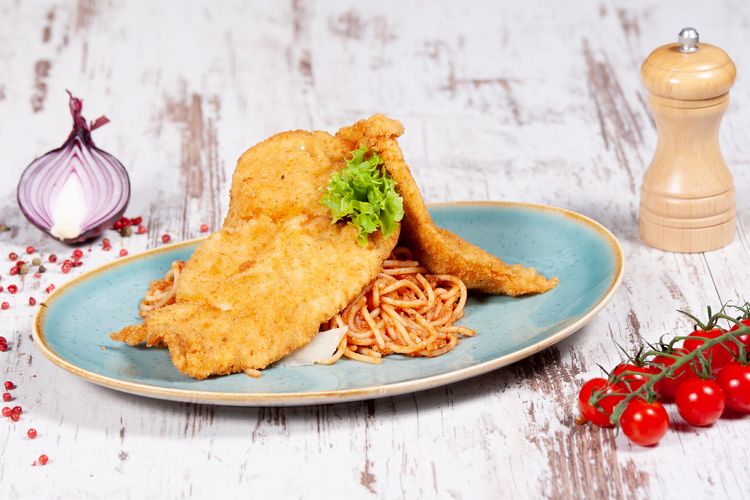 sonkával sajttal töltött, milánói spagettivel (Allergén anyag: tej, zeller, búzaliszt, tojás)