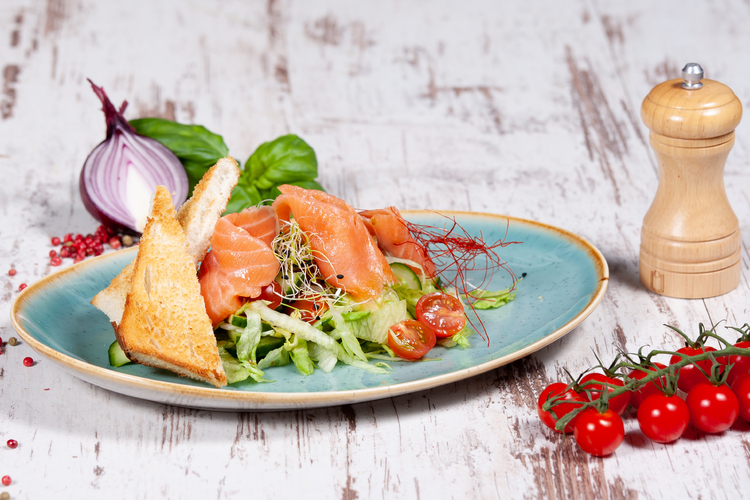 lazacszeletek, paradicsom, kígyóuborka, jégsaláta, pirítós