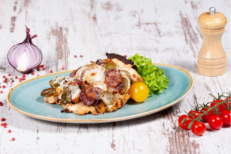 natúr szeleten pirított kolbász, uborka, hagyma sajttal kemencében sütve