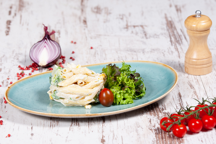 csirkemellcsíkok, brokkoli, kukorica tejszínesen, parmezán, mozzarella sajt