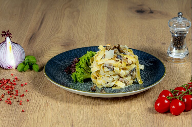 pirított erdei gombakeverék, jércemell, fokhagyma, szélesmetélt, tejszín, trappista